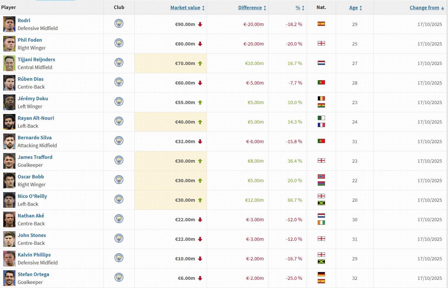 北京时间10月17日,德转市场(Transfermarkt)公布了最新一期的英超球员身价评估数据。在这份备受关注的榜单中,曼城队内两名核心球员罗德里和福登的身价均出现显著下滑,各自减少了2000万欧元。