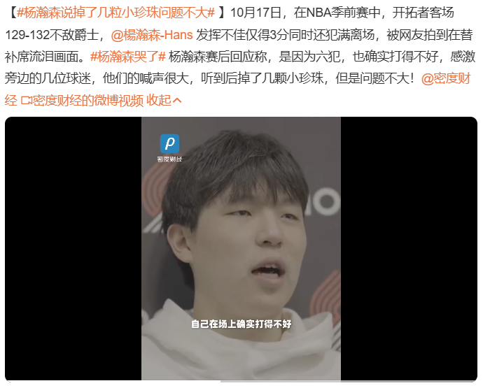 北京时间10月17日,NBA季前赛迎来收官之战,波特兰开拓者队以129-132惜败犹他爵士队。对于中国新星杨瀚森而言,这场比赛成为他加盟NBA后最艰难的一夜——全场仅得3分、篮板颗粒无收、末节六犯离场,赛后他掩面落泪的画面通过镜头传遍篮球界。这位20岁的中锋替补登场15分钟,投篮2中1(含1记三分),贡献3分1助攻1抢断1盖帽,却也出现3次失误和6次犯规。面对媒体,他坦诚道:“情绪确实激动,一个是六犯,一个是打得不好……掉了几颗小珍珠,但问题不大!”