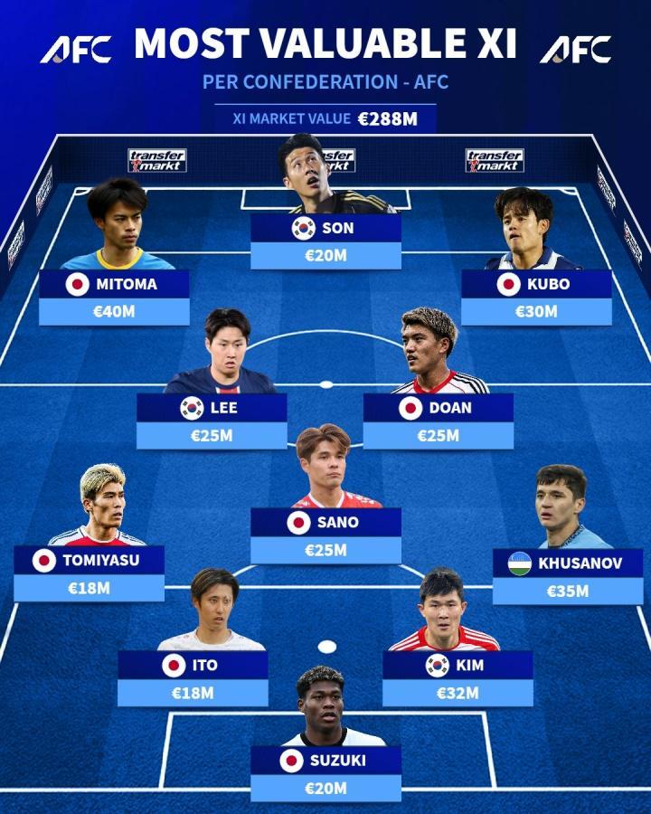 近日,权威身价统计网站《德国转会市场》公布了亚洲身价最高的首发11人阵容,总身价高达2.88亿欧元。其中,亚洲排名第一的日本队独占7席,成为最大赢家,而33岁的韩国球星孙兴慜也凭借2000万欧元的身价成功入选。