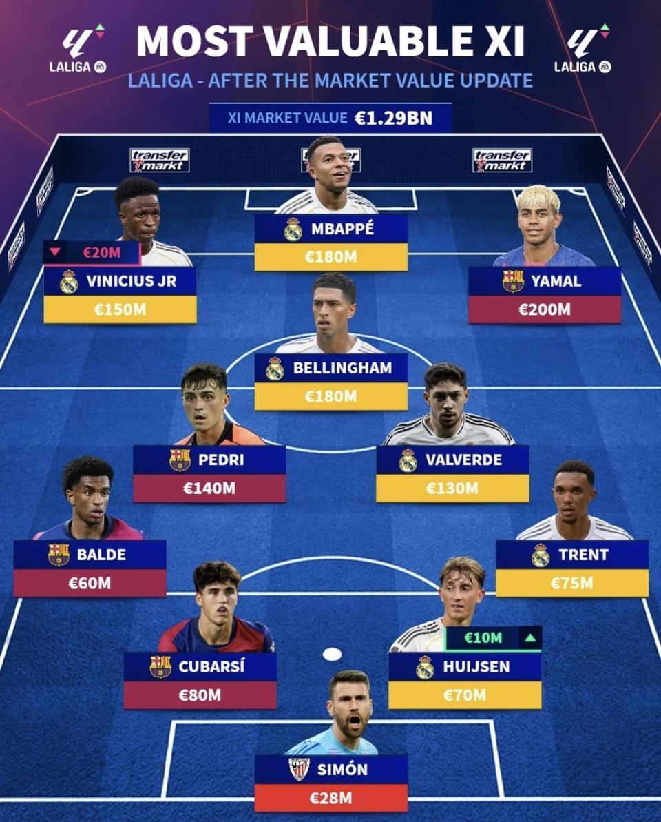 近日,德国转会市场发布了西甲球员的最新身价,并评选出了“西甲最有价值11人阵容”。这支豪华阵容的总身价高达12.9亿欧元,引发了球迷和媒体的广泛关注。其中,锋线由亚马尔、姆巴佩和维尼修斯领衔,中场则有贝林厄姆坐镇,后场则包括库巴尔西、胡伊森、阿诺德等实力派球员。值得一提的是,维尼修斯的身价在此次更新中小幅下调了2000万欧元。接下来,我们将围绕“名不副实”与“物有所值”两条主线,结合即战力、健康稳定性、样本量与位置稀缺度,对这支阵容进行深入评估。