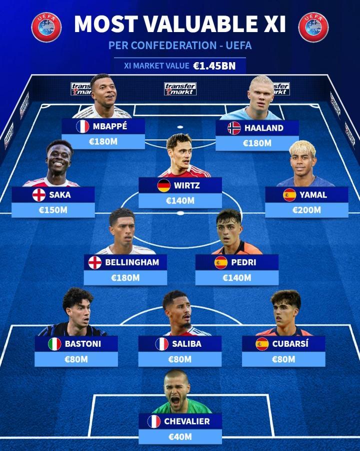 近日,知名身价统计网站《德国转会市场》公布了欧足联球员身价最高的阵容名单,引发了足坛的广泛关注。这份名单中,11名入选球员有7人身价超过1亿欧元,整套阵容总价值高达14.5亿欧元,堪称足坛“无敌战舰”!