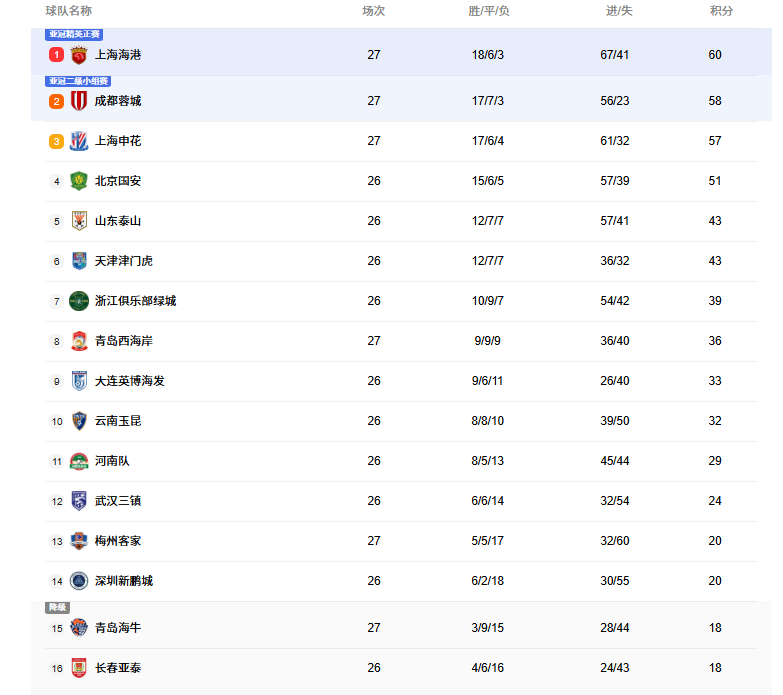 北京时间10月17日晚,中超联赛第27轮迎来三场焦点对决,积分榜格局因这三场激战发生剧烈震荡。上海申花客场2-1逆转青岛西海岸,成都蓉城主场3-1力克梅州客家,上海海港客场4-3险胜青岛海牛。三轮战罢,中超争冠与保级形势呈现前所未有的胶着状态——三支劲旅争夺冠军宝座,四支球队深陷保级泥潭。