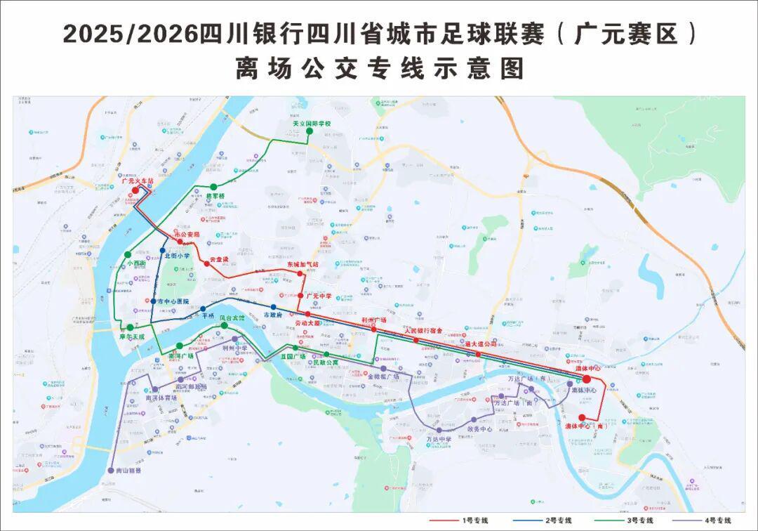 为了做好2025/2026四川银行四川省城市足球联赛(广元赛区)的公交运输保障工作,广元市公交公司特别在赛事期间开通了3条观赛公交专线和4条离场公交专线,确保球迷能够便捷、安全地前往和离开比赛现场。