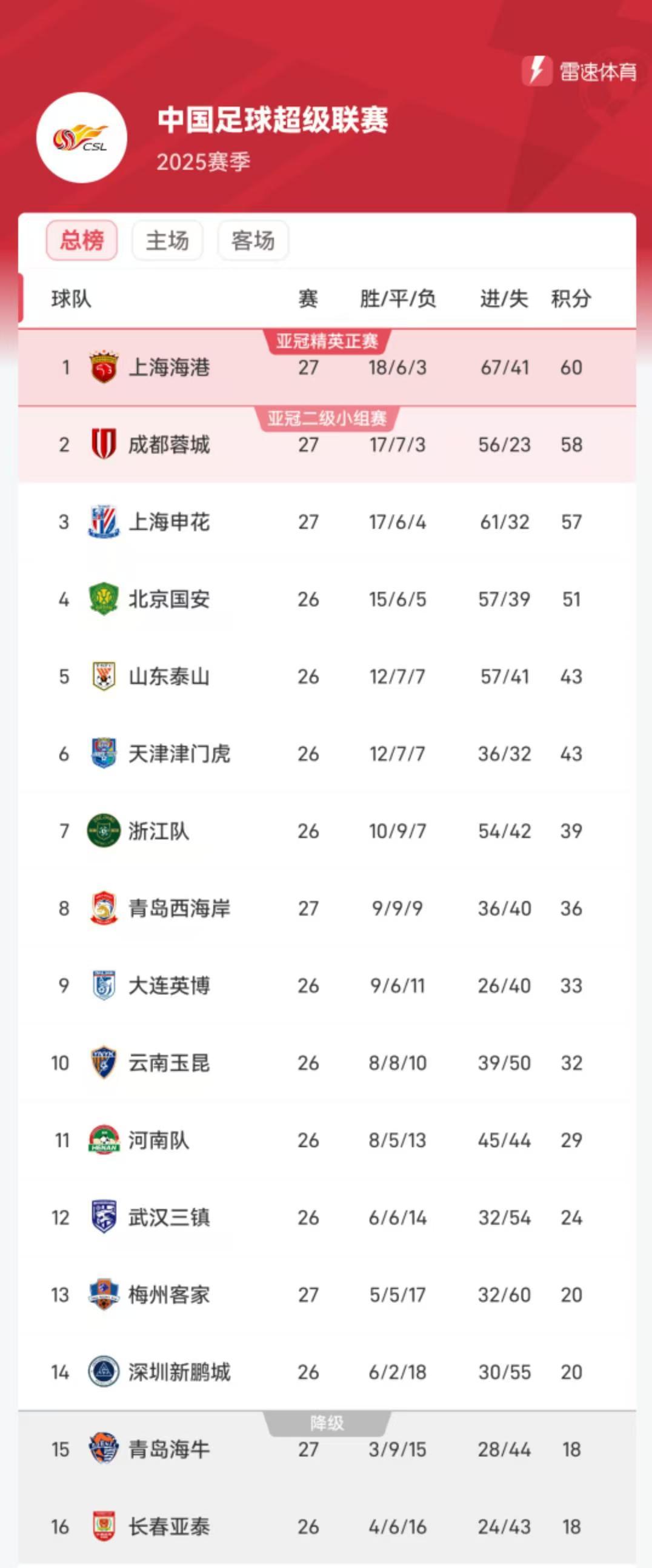雷速体育10月17日讯,中超联赛第27轮赛事今日率先展开数场激战。引人注目的是,目前积分榜排名前三的球队在本轮比赛中均顺利取胜,因此,它们的排名并未发生任何变动。
