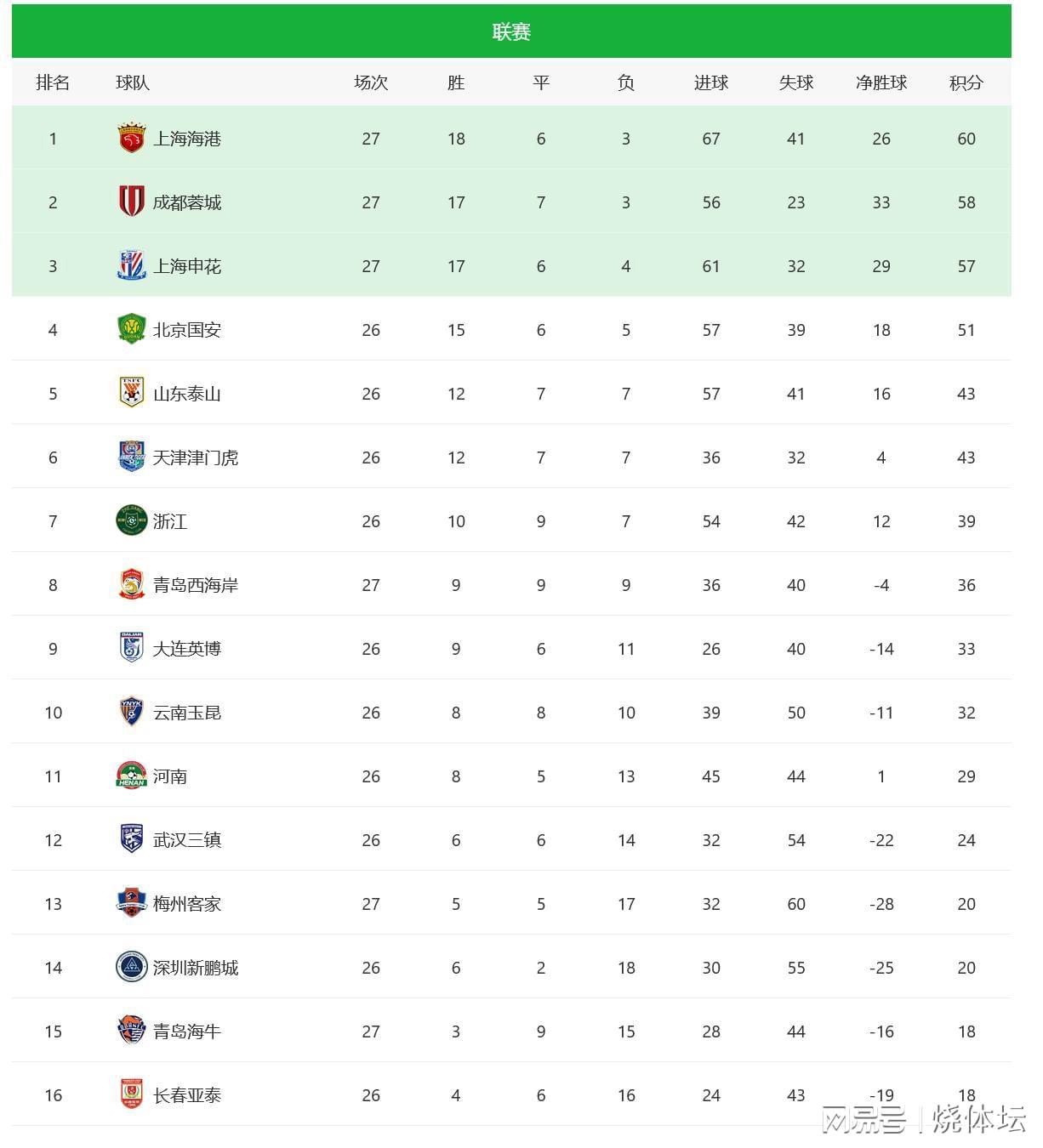 中超联赛积分榜最新动态