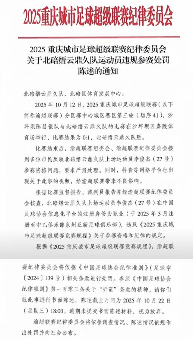 根据网络流传的“处罚陈述通知”,“渝超”联赛纪律委员会已向北碚缙云鼎久队和北碚区体育发展中心发出正式通知,要求就运动员违规参赛一事进行书面陈述,截止时间为10月22日18时。