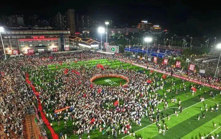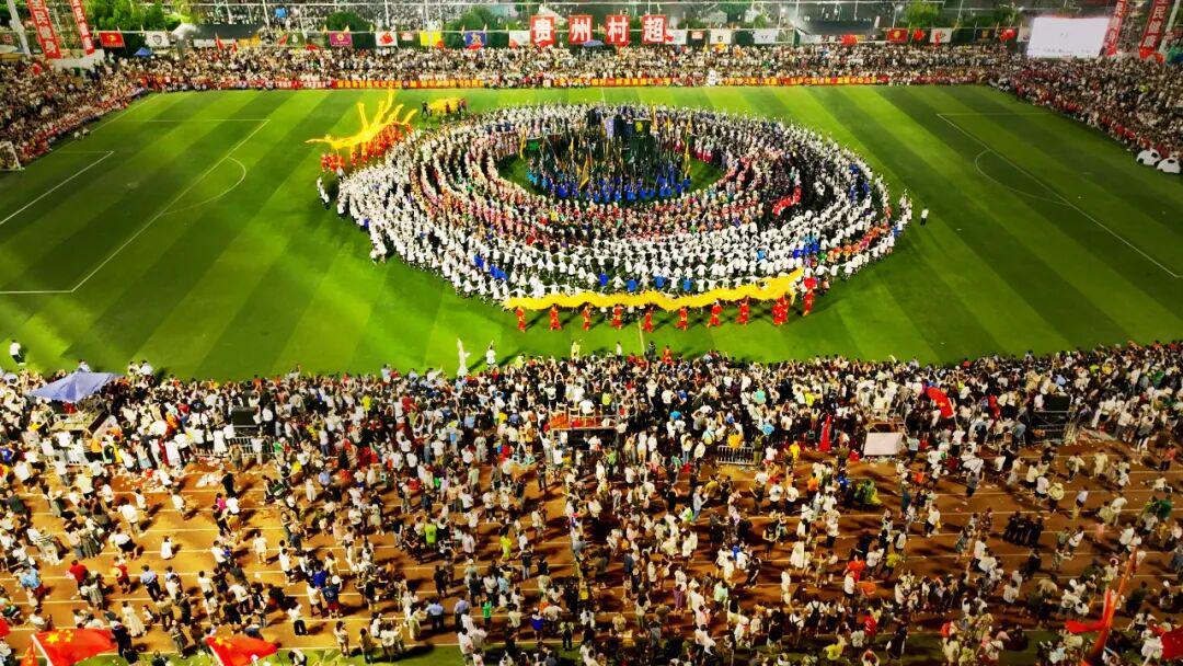 △7月26日活动结束后,人们涌向贵州‘村超’球场跳起民族舞蹈‘多耶’(无人机照片)。图源:新华社