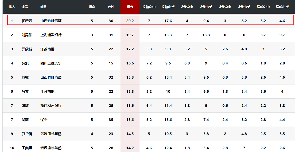 在山西女篮多位主将缺阵的情况下,翟若云承担起领袖重任,带领球队闯入锦标赛前六。目前得分榜上,她以20.2分稳居榜首,领先第二名刘禹彤0.5分,罗欣棫、韩旭等国手紧随其后,形成激烈竞争态势。