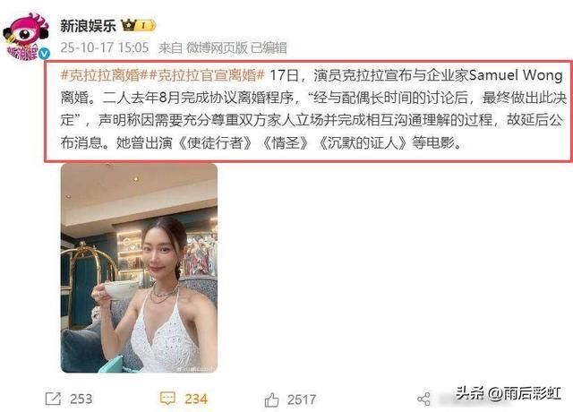 近日,39岁的知名女星克拉拉(Clara)正式对外宣布,她与丈夫Samuel Wong的婚姻已走到尽头。两人于2018年步入婚姻殿堂,然而在2024年10月才公开这一消息,期间已分居近一年半。这段长达6年的婚姻并未留下子女,也未因财产问题产生纠纷。克拉拉表示,离婚并非因争吵或外界压力,而是希望先妥善处理家庭事务,再对外公布,以避免家人受到媒体打扰。