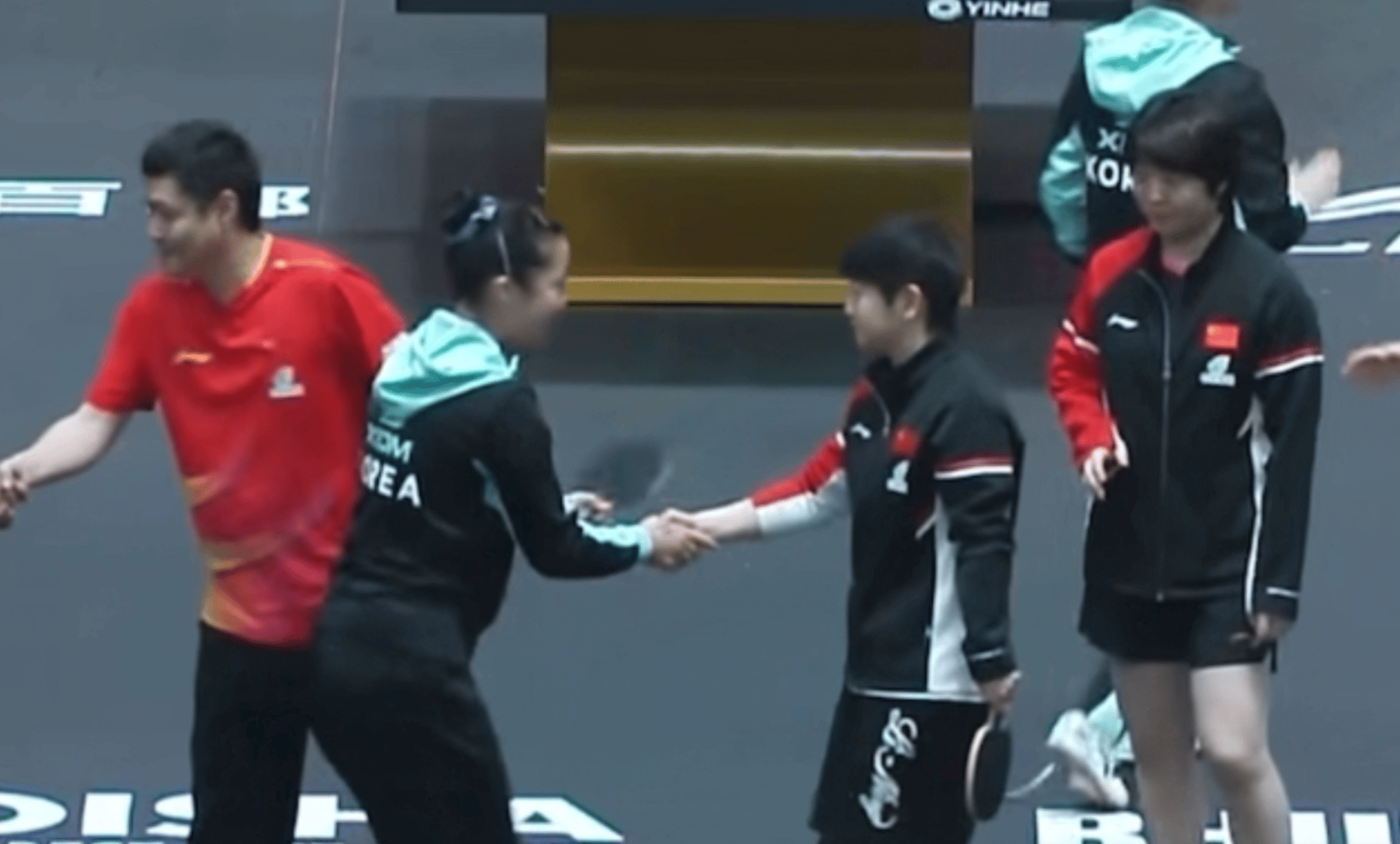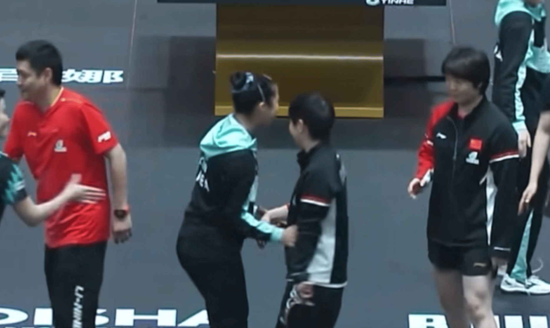 比赛结束后,双方球员和教练握手致意。申裕斌笑嘻嘻地走向孙颖莎,和她握手时,突然伸手轻触了孙颖莎的腹部,这一举动带有玩笑意味,却显得十分可爱。
