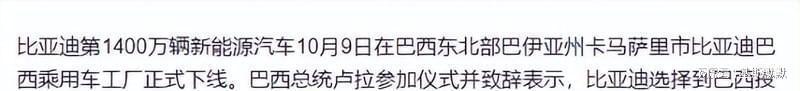 2025年10月9日,巴西巴伊亚州卡马萨里市的比亚迪工厂内,全球第1400万辆新能源车正式下线。这一里程碑事件不仅标志着比亚迪成为全球首家达成此产量的新能源车企,更因巴西总统卢拉的亲自到场而备受瞩目。卢拉不仅成为宋Pro车型的首位车主,更在交车仪式上动情表示,比亚迪的到来让巴西人找回了工业发展的自豪感。工厂门口的道路被正式命名为“比亚迪路”,这一细节深刻体现了当地民众对比亚迪的认同与期待。