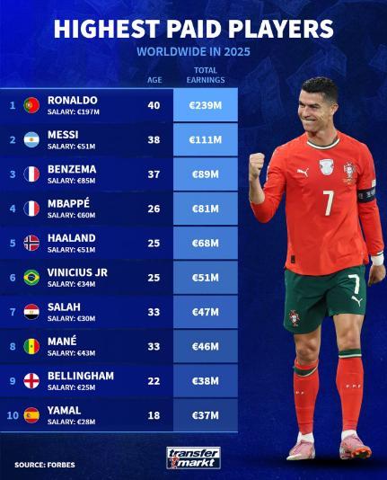 雷速体育10月18日讯,近日,德国权威足球数据网站《转会市场》发布了2025年足球运动员收入排行榜,引发了广泛关注。在这份榜单中,40岁的葡萄牙巨星C罗以惊人的2.39亿欧元年收入傲视群雄,稳居榜首。而紧随其后的,则是38岁的阿根廷传奇梅西,他的年收入达到了1.11亿欧元,两人成为唯二年收入过亿欧元的球员,再次证明了他们在足坛的统治力。