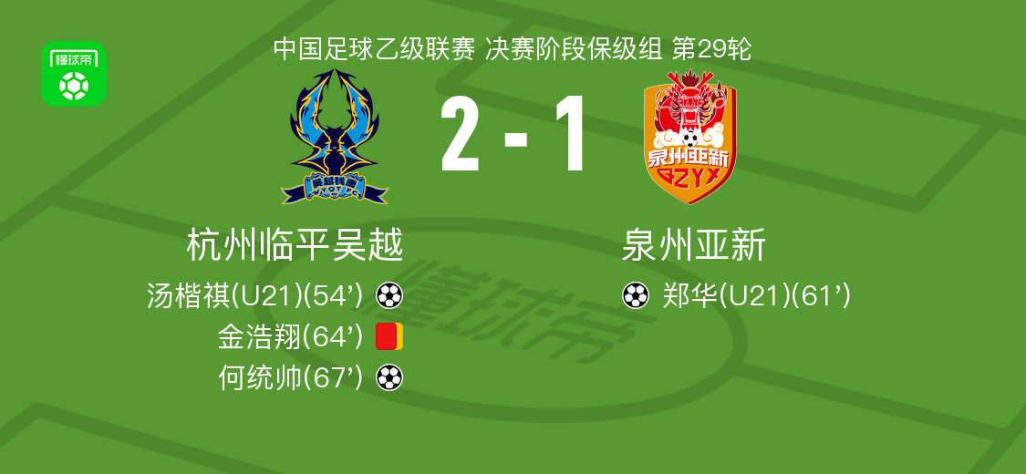 北京时间10月18日,中国足球乙级联赛决赛阶段保级组迎来第29轮焦点战,杭州临平吴越坐镇主场迎战泉州亚新。经过90分钟激战,杭州临平吴越凭借汤楷祺与何统帅的进球,以2-1力克对手,成功全取三分。
