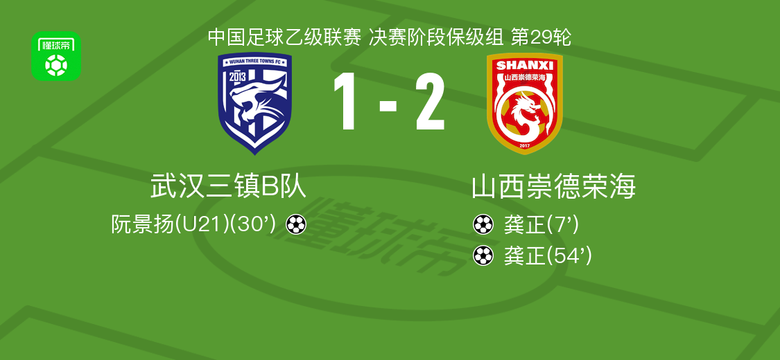 北京时间10月18日,中国足球乙级联赛决赛阶段保级组第29轮迎来一场焦点对决,武汉三镇B队坐镇主场迎战山西崇德荣海。经过90分钟激烈角逐,山西崇德荣海凭借龚正的梅开二度以2-1力克对手,成功全取三分。