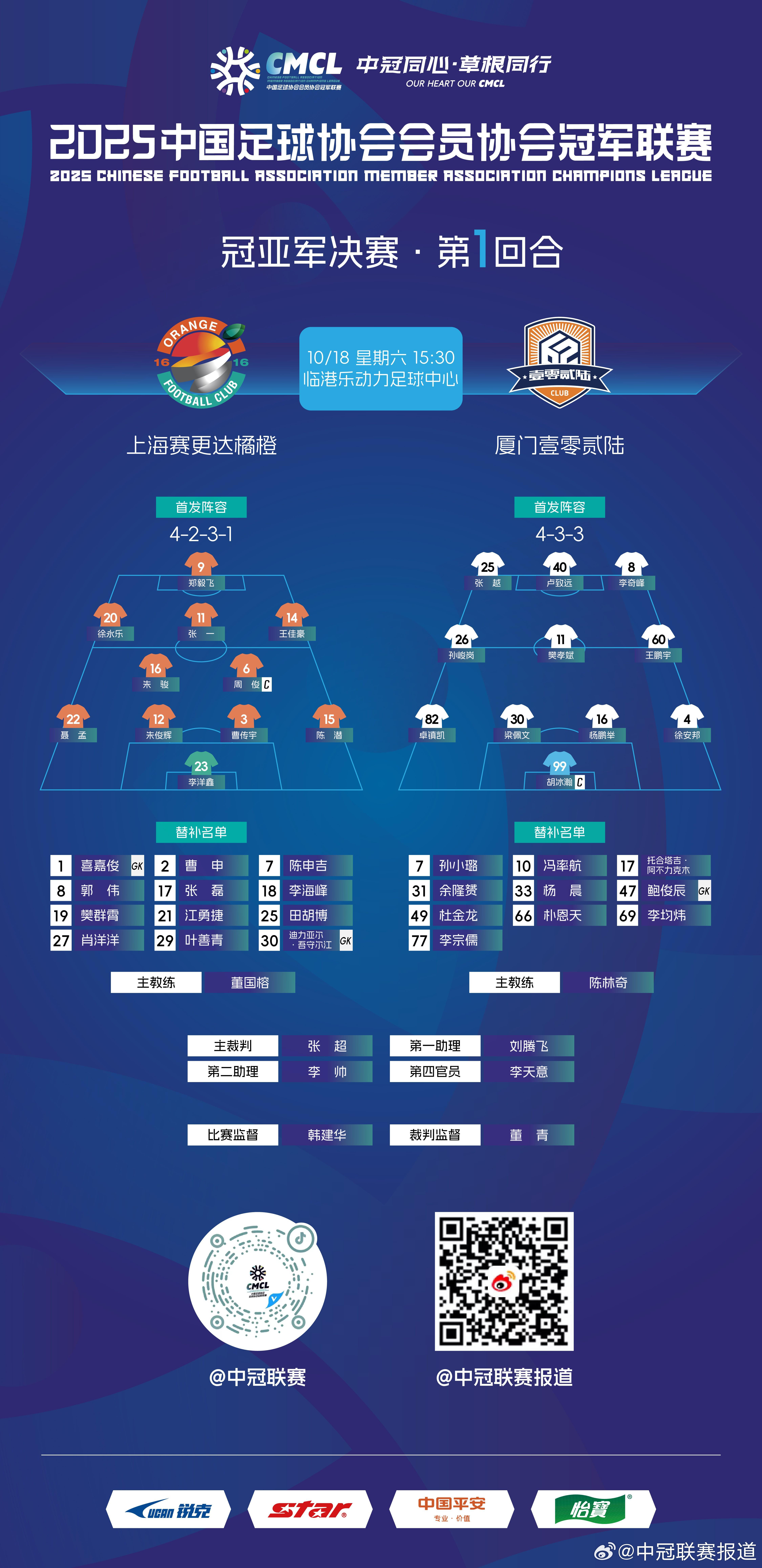 北京时间10月18日15:30,2025赛季中国足球协会会员协会冠军联赛(简称“中冠联赛”)冠亚军决赛首回合打响,上海赛更达足球俱乐部与厦门壹零贰陆足球俱乐部展开巅峰对决。赛前,本场比赛的首发名单正式公布,引发球迷广泛关注。