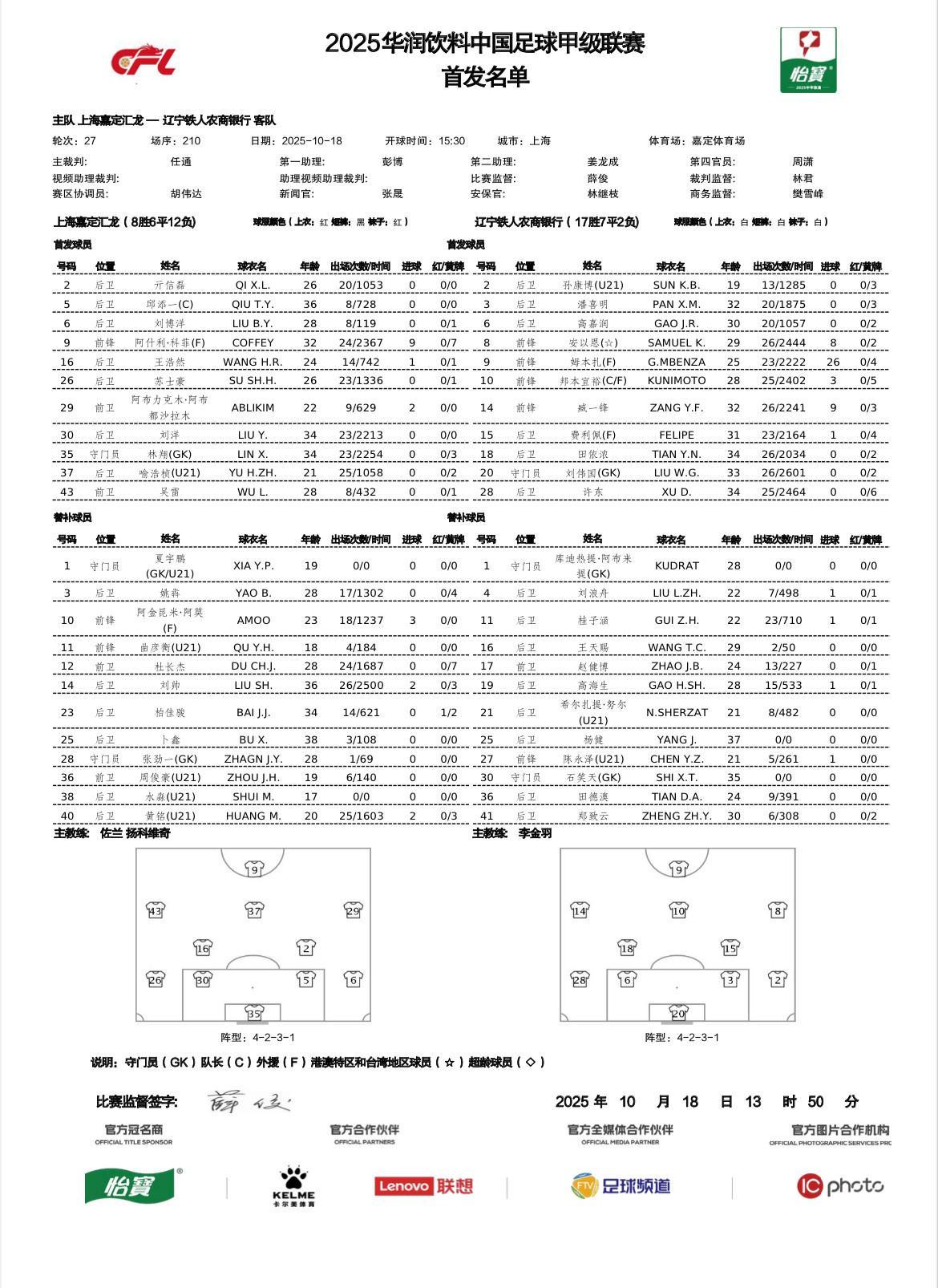北京时间10月18日15:30,中甲联赛第27轮迎来一场焦点对决,辽宁铁人队将客场挑战上海嘉定汇龙队。赛前,双方公布了本场比赛的首发名单,引发球迷广泛关注。