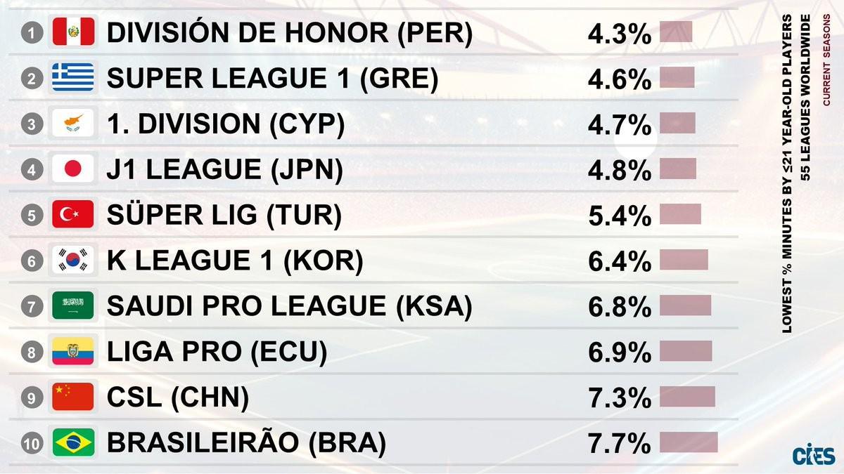 根据CIES的详细统计数据,秘鲁甲级联赛以4.3%的U21球员出场时间占比成为全球最低,紧随其后的是希腊超级联赛(4.6%)和塞浦路斯甲级联赛(4.7%)。日本J1联赛以4.8%的比例排名第四,韩国K联赛以6.4%的比例排名第六,中国超级联赛则以7.3%的比例位列第九。
