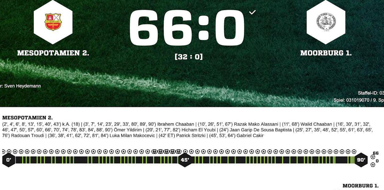 最终,穆尔堡TSV以0-66的耻辱比分输掉了比赛。主帅帕特里克在赛后表示:“我们不敢放弃比赛,因为如果不出场,我们这赛季就会提前结束。下半场,我们放弃了死守,只在后场留一个门将和一条后防线,其他人全部冲上前,试图改变局势。”
