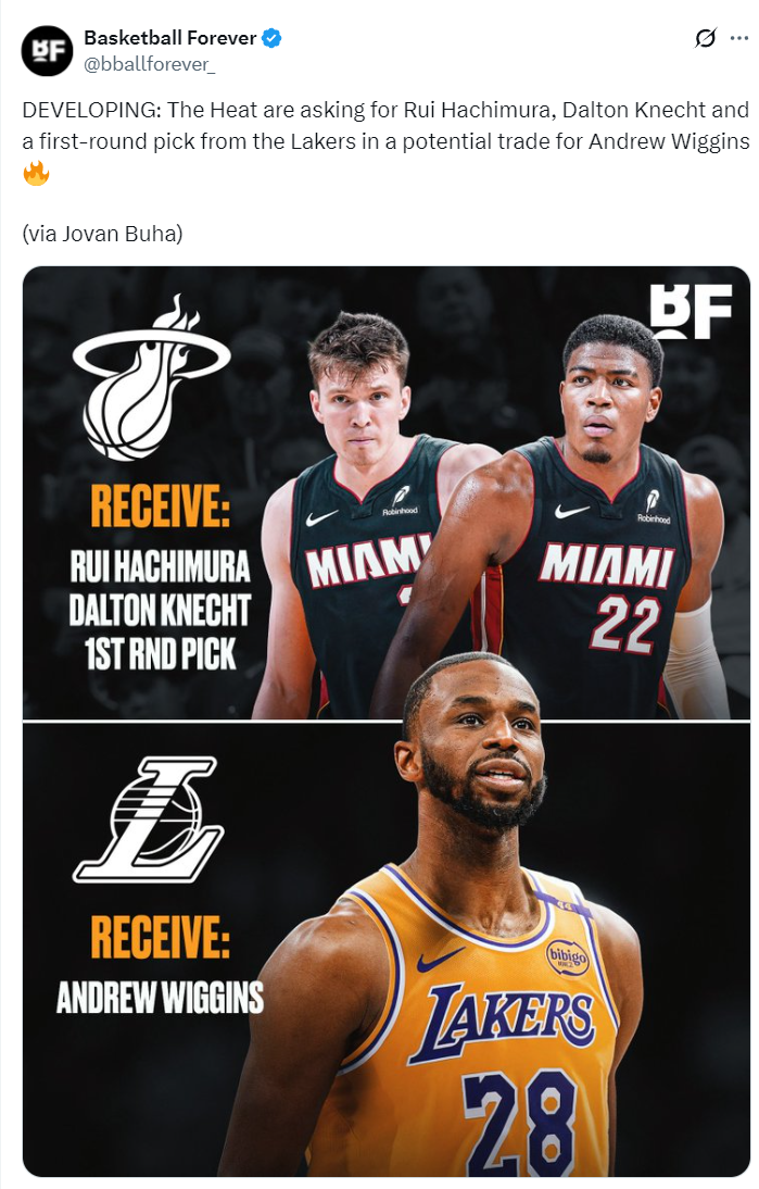 上个月,湖人还重启了与热火的交易谈判,但最终因热火要价过高而搁浅。据湖人记者约什-布哈透露,热火对威金斯的要价是湖人一个未来不保护的首轮签、道尔顿-克内克特以及八村垒,即要求1换3的交易方案。