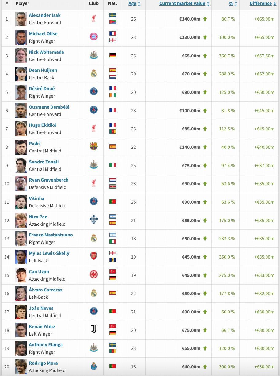 - 沃尔特马德(纽卡前锋):总上涨5750万欧,现身价6500万欧