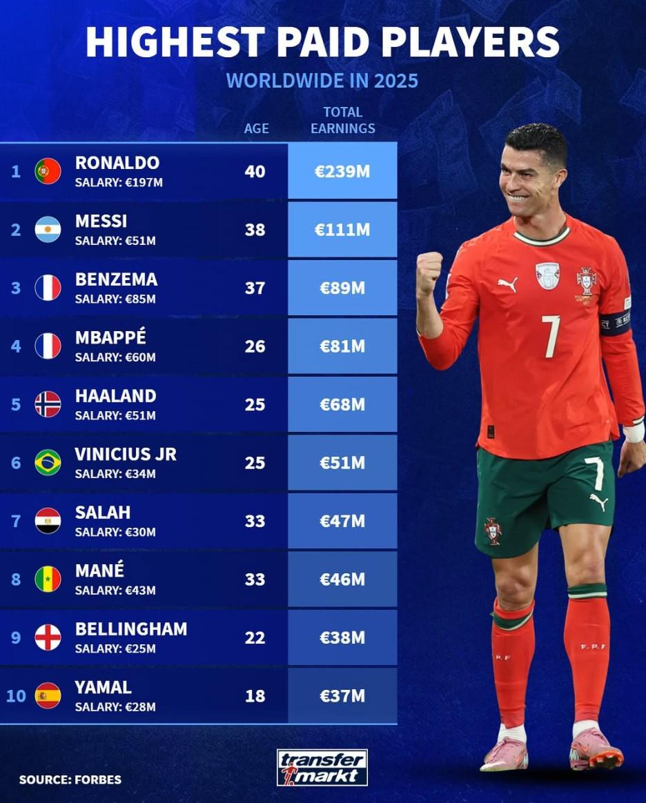 北京时间10月18日,权威转会数据机构德国转会市场(德转)依据福布斯公开数据,正式发布了2025年世界足坛球员收入排行榜。葡萄牙巨星C罗以2.39亿欧元总收入登顶,阿根廷传奇梅西和法国前锋本泽马分列二三位,而法国新星姆巴佩则成为欧洲足坛收入最高的球员。