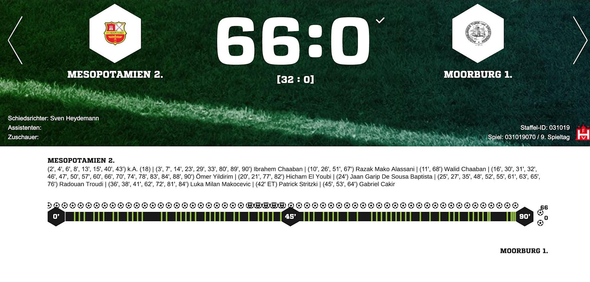 上周日的这场比赛,无疑成为了德国地区联赛历史上最为惨烈的失利之一。穆尔堡TSV在汉堡地区联赛对阵梅索波塔米亚二队时,全场遭遇对手的猛烈攻势,90分钟内被攻入66球,平均每82秒就丢一球,场面极为被动。