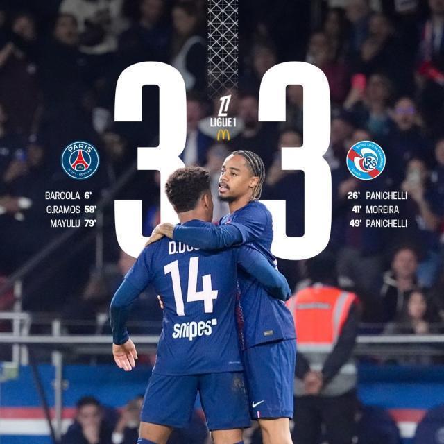 关键时刻,是3场比赛踢了3个不同位置的马尤卢为巴黎扳平了比分。第79分钟,他后排插上,接李刚仁传球杀入禁区,尽管第一脚射门被彭德斯挡出,但马上机敏地用头把朝着自己弹回来的皮球顶入了远角,3比3。在比赛剩余时间里,双方都有过把比分改写成4比3的机会,但都没有把握住。