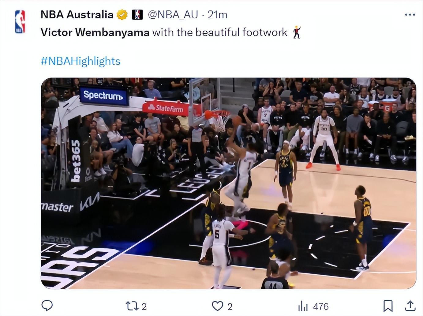 首节比赛,文班亚马便4投3中,其中三分球1中1,轻松拿下7分4篮板2盖帽。次节比赛,他继续保持高效,2投1中得到4分4篮板1助攻1抢断。到了第三节,文班亚马更是火力全开,3投3中再取6分4篮板2盖帽。整场比赛下来,他几乎未出汗便轻松吊打了步行者队的内线群。