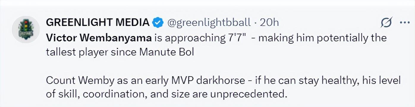 近期,外界对文班亚马的身高产生了巨大疑问。有谣传称,文班亚马的身高已经从7尺4寸(约2.24米)长到了7尺7寸(约2.31米)。这一谣传迅速引发了广泛关注,多家美媒更是将文班亚马视为新赛季的MVP大热门。