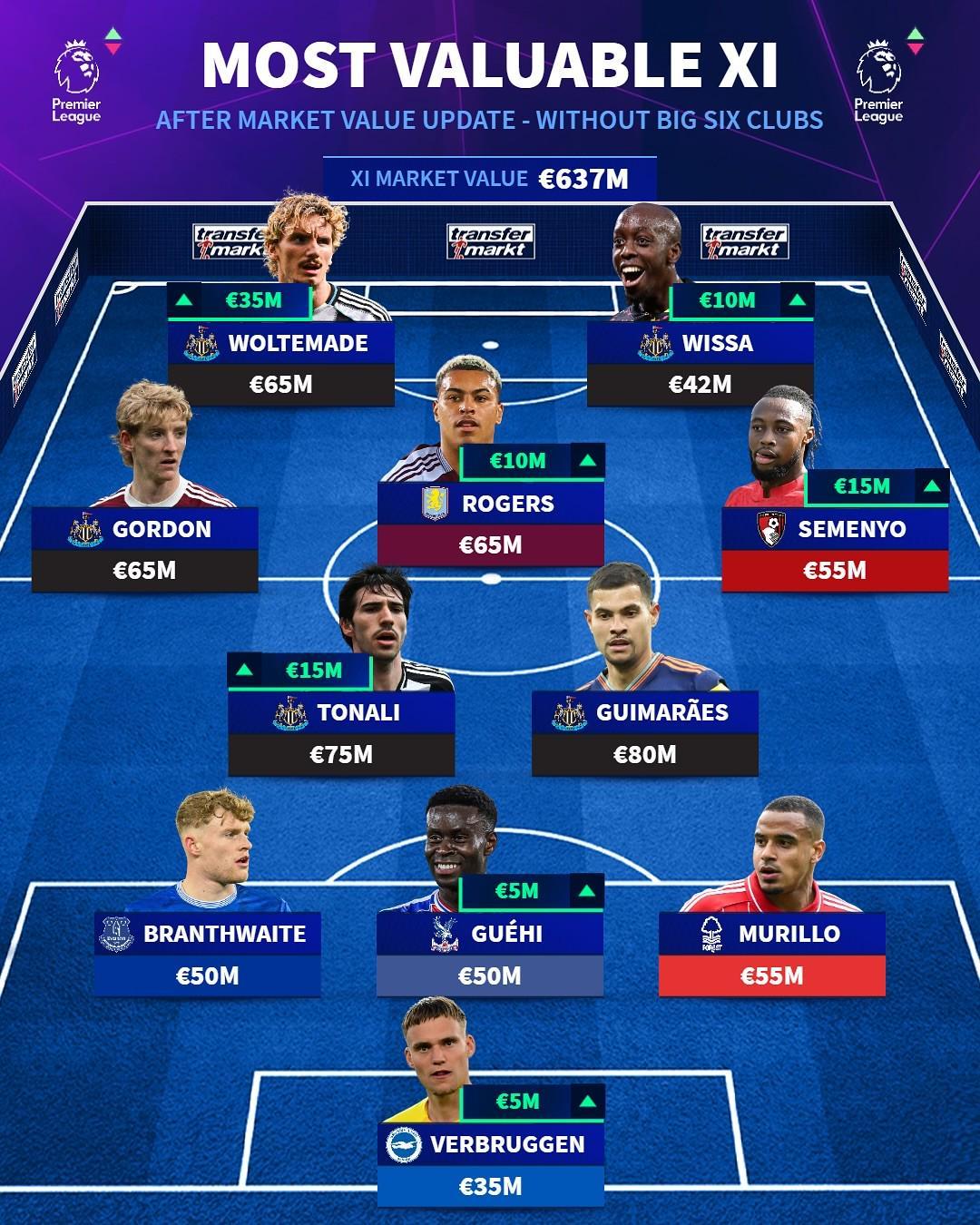 德国转会市场网站(德转)在最新更新了英超球员身价后,正式发布了非BIG6球队的最贵阵容。令人瞩目的是,纽卡斯尔联队成为最大赢家,共有五名球员入选,其中沃尔特马德领衔锋线,展现出强大的阵容实力。