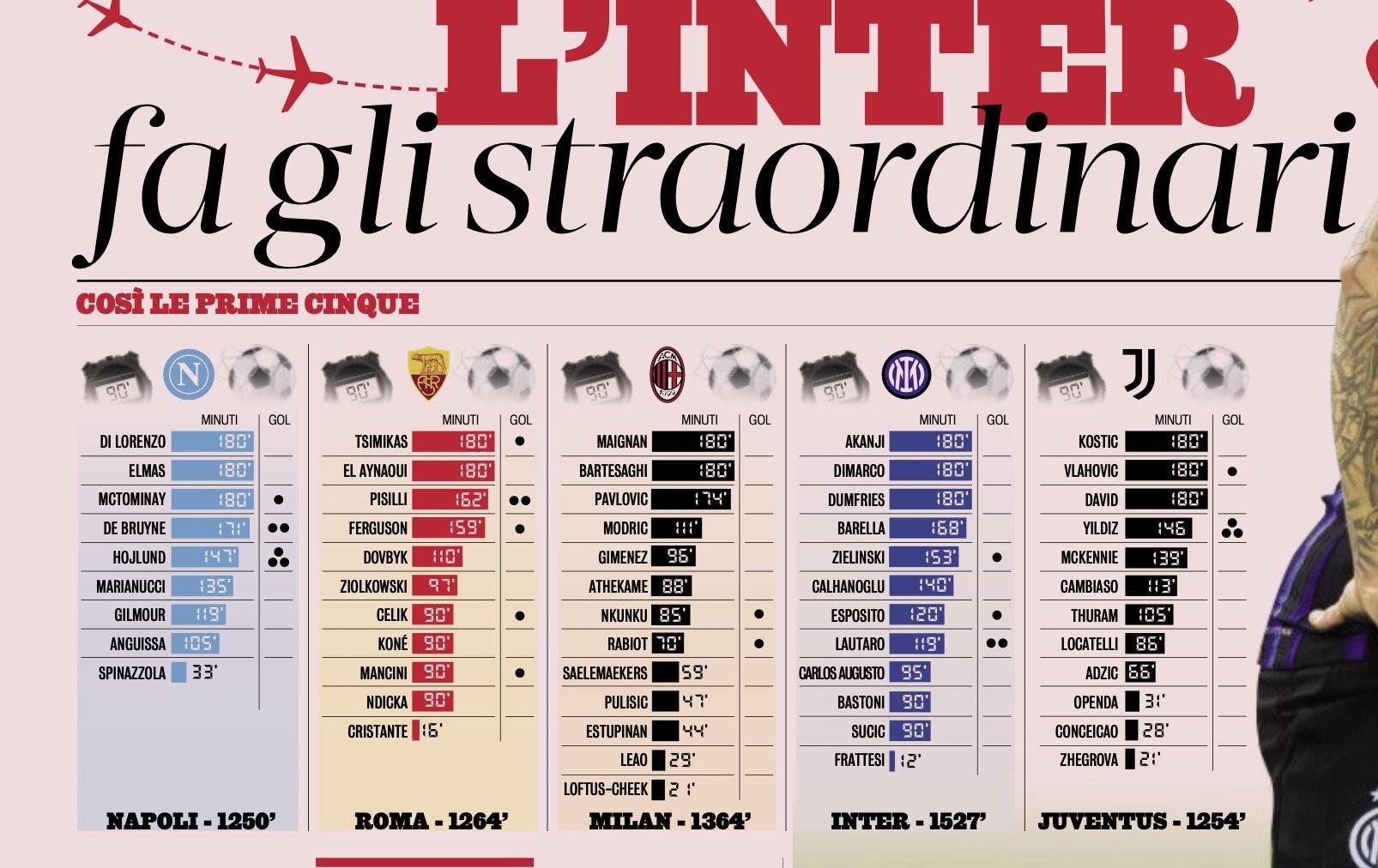 北京时间10月18日,据《米兰体育报》权威统计,在意甲联赛目前排名前五的球队中,各队球员在10月国际比赛日的总出场时间数据已新鲜出炉。其中,国际米兰以12名球员合计1527分钟的出场时间高居榜首,AC米兰则以13名球员1364分钟紧随其后。