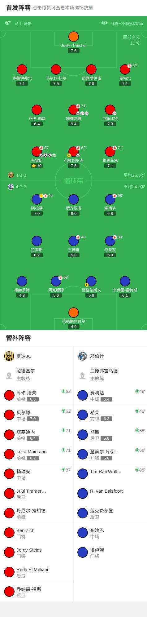 比赛开始后,罗达JC迅速进入状态,展开了猛烈的攻势。第17分钟,罗达JC球员尼斯比特送出精准助攻,布雷伊抓住机会打入一球,为球队首开纪录。仅仅4分钟后,施维尔滕再次送出妙传,范登胡尔克轻松破门,将比分扩大为2-0。