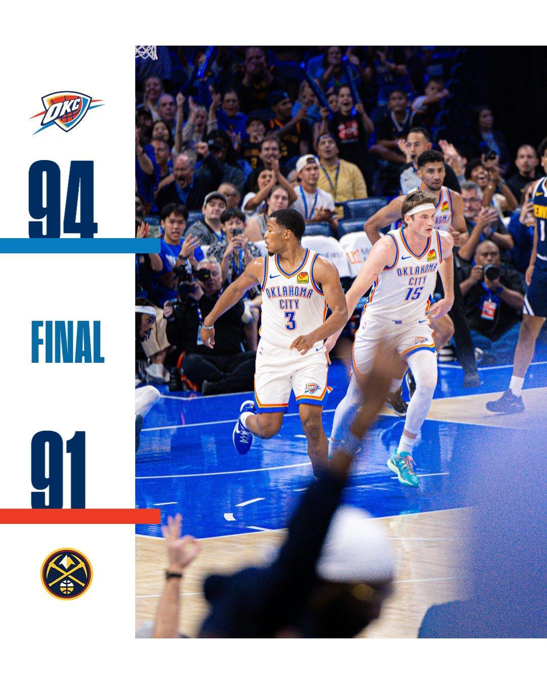 摩西布朗2罚1中,为掘金打破长达6分钟的得分荒。扬布拉德反击上篮得分,贝茨连投带罚得到3分,距离终场仅剩37秒,雷霆落后1分并请求暂停。吉昂轰进远投,柯蒂斯-琼斯抛投打成了2+0还以颜色。掘金连续补篮不进,吉昂轰进压哨三分球,雷霆以94比91绝杀掘金,上演了16分大逆转好戏。