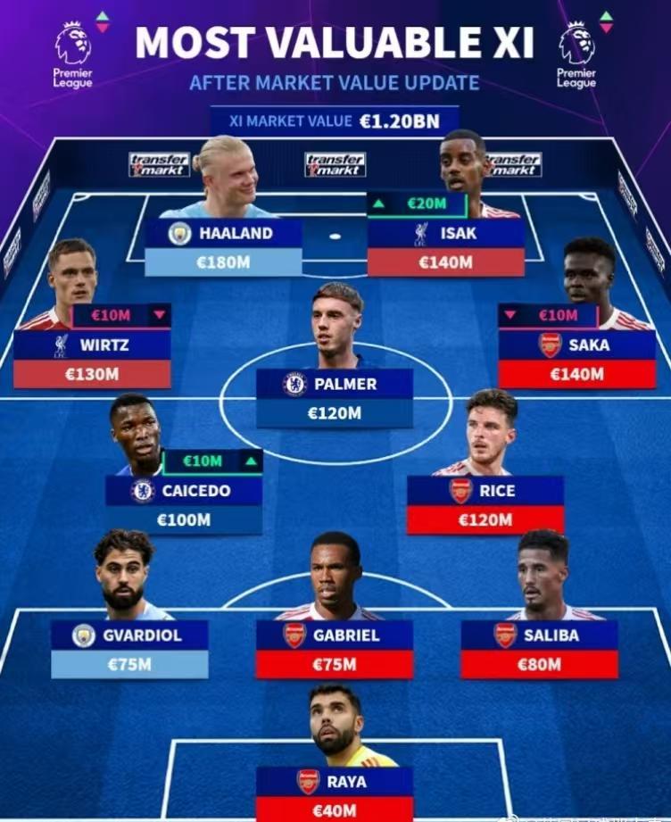 在这份星光熠熠的名单中,曼城前锋哈兰德以1.8亿欧元的身价高居榜首,成为英超乃至全球最贵的球员之一。阿森纳则凭借萨卡、赖斯等核心球员的出色表现,占据了阵容的近半壁江山。切尔西的凯塞多与帕尔默、利物浦的维尔茨以及纽卡斯尔的伊萨克也均以过亿身价跻身其中,展现了英超联赛的顶级竞争力。