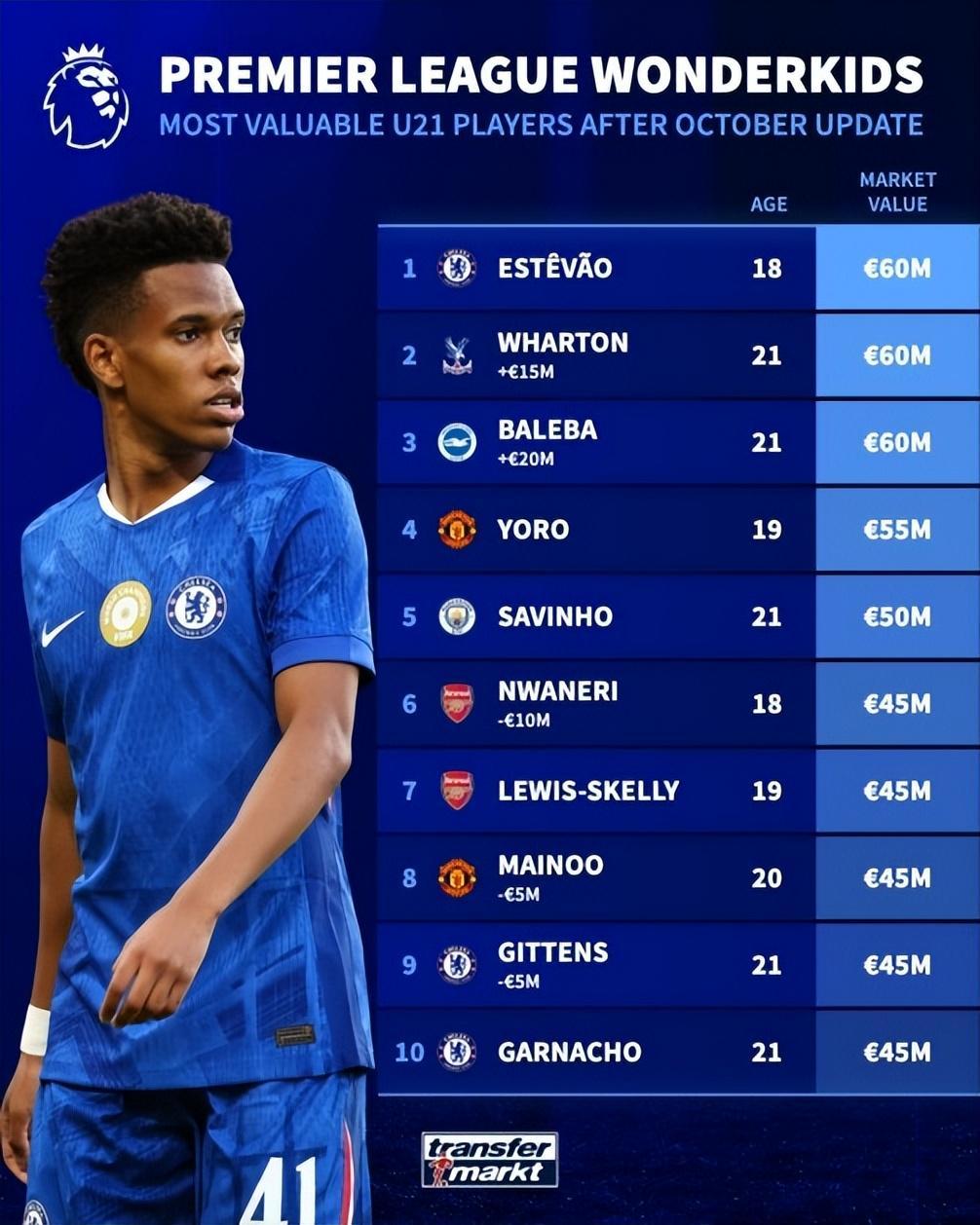 3 - 英超U21球员身价榜:切尔西、水晶宫、布莱顿领跑