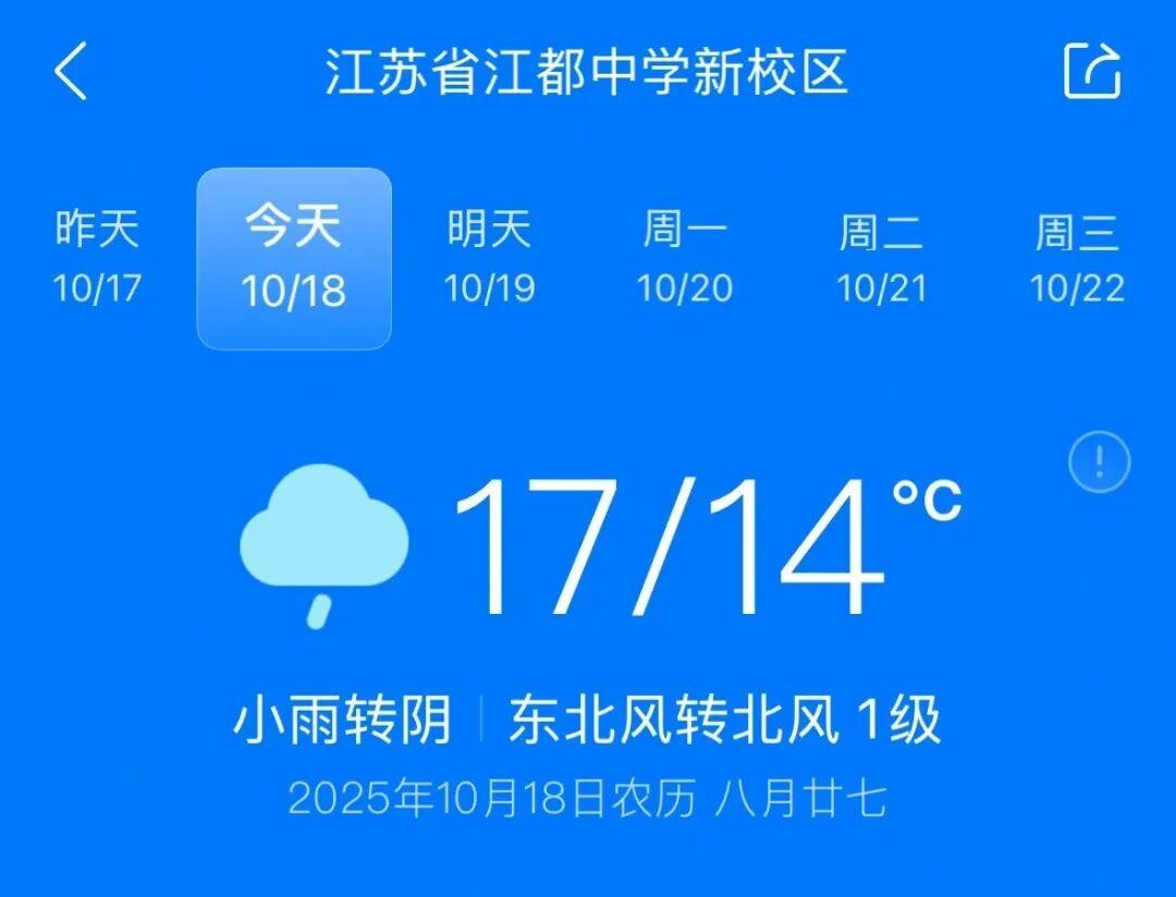 10月18日天气:小雨转阴,东北风转北风1级,14~17℃,可能出现降雨。