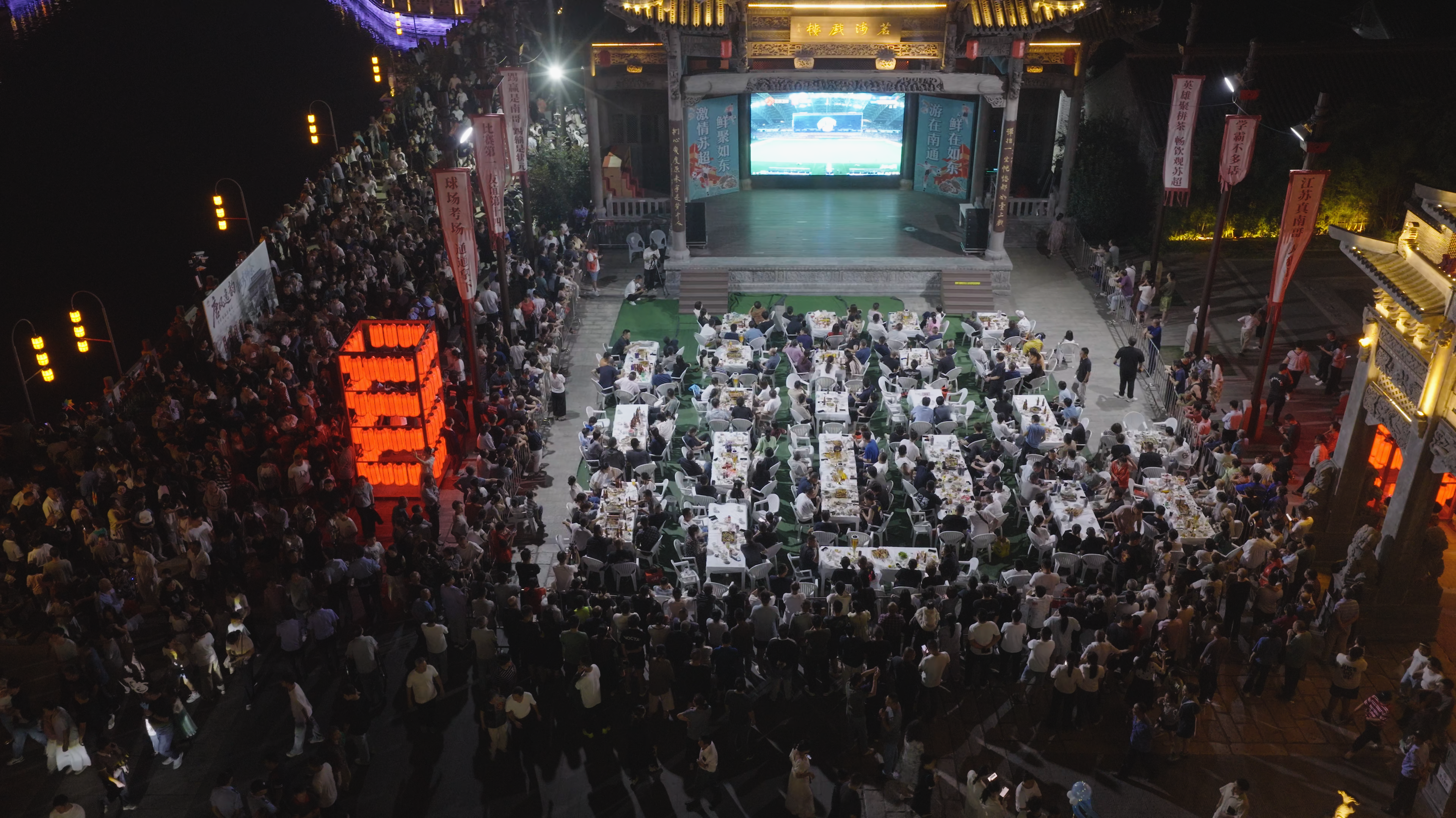10月7日,如东球迷在“第二现场”栟茶古镇观看南通队比赛(无人机照片)。宫屹 摄