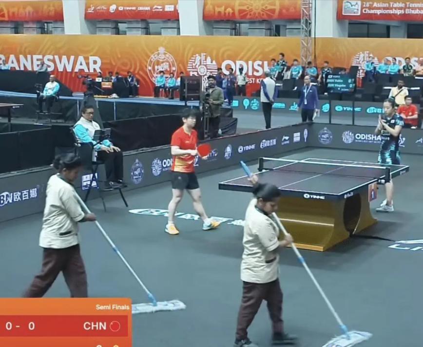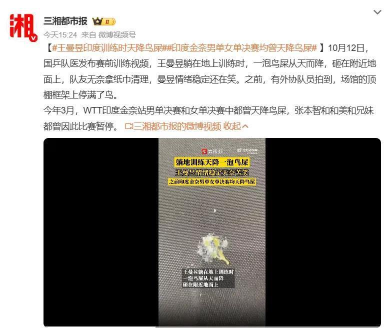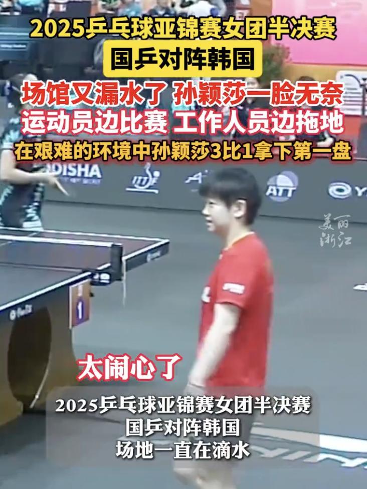 比赛场馆的准备程度同样令人震惊。赛前一天场地仍未完工,电子计分屏尚未安装。正式比赛期间更是状况频发:孙颖莎比赛时场馆顶棚漏水,林诗栋对阵时无人机低空掠过球台,王曼昱训练时遭遇鸟粪空袭,甚至有青蛙出现在比赛场地。