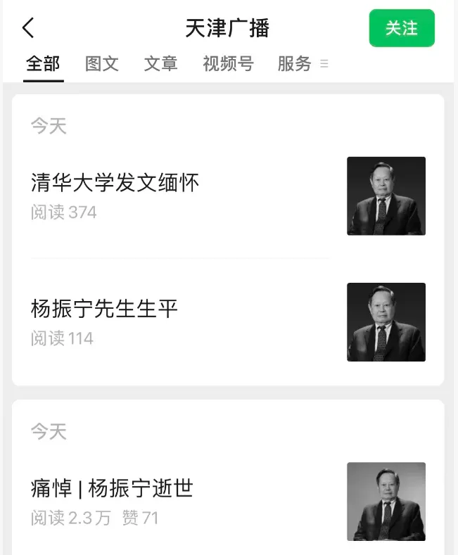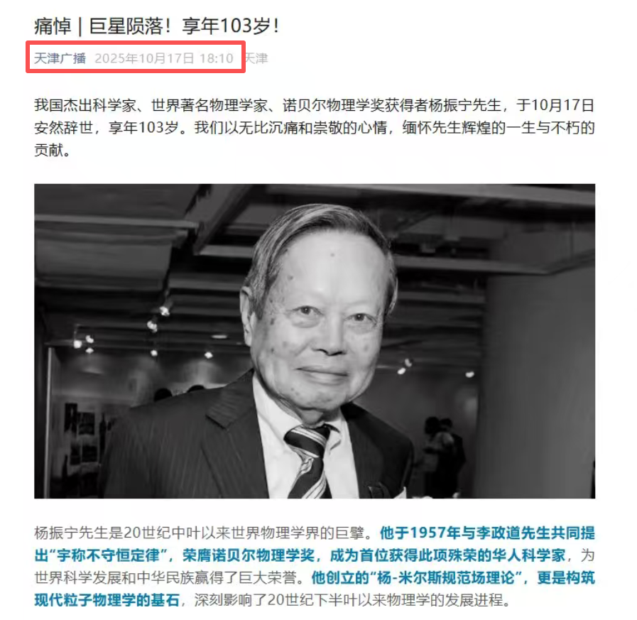 值得一提的是,天津广播在消息正式公布前一天傍晚六点十分左右,就抢先播发了杨振宁老先生去世的新闻。