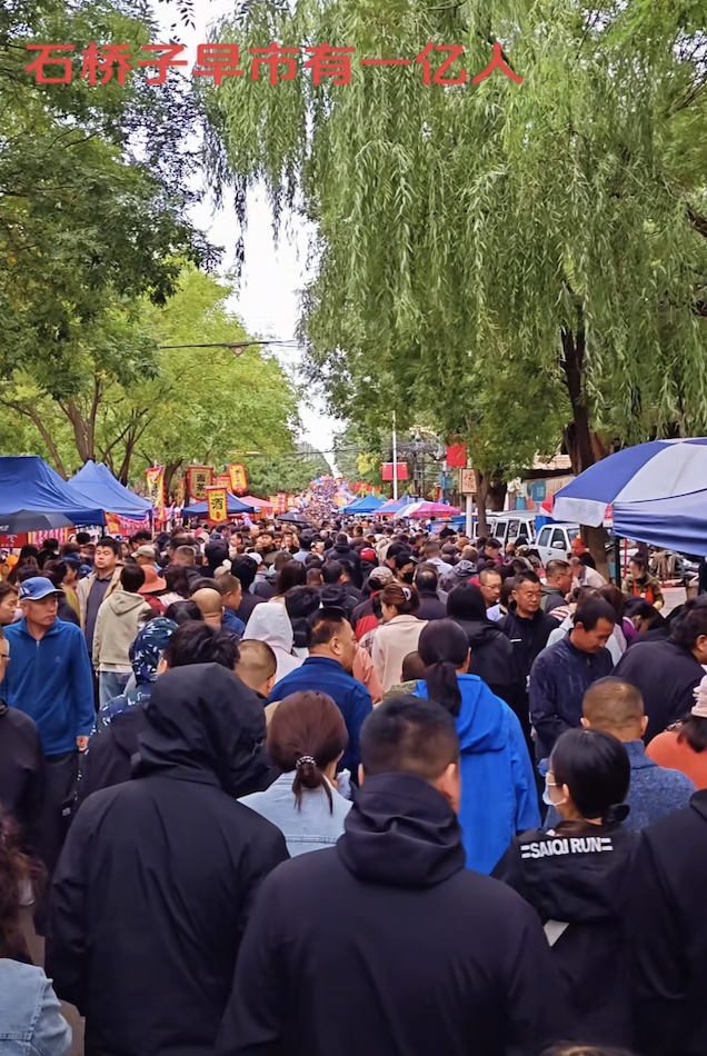 十一期间的东北早市挤满了全国各地的游客。有人连夜到东北,下了车就直奔早市,连觉都没睡。号称“亚洲第一长早市”的石桥子早市,其火爆场面更是直接被网友调侃:“至少有一亿人在这儿挤着呢!”