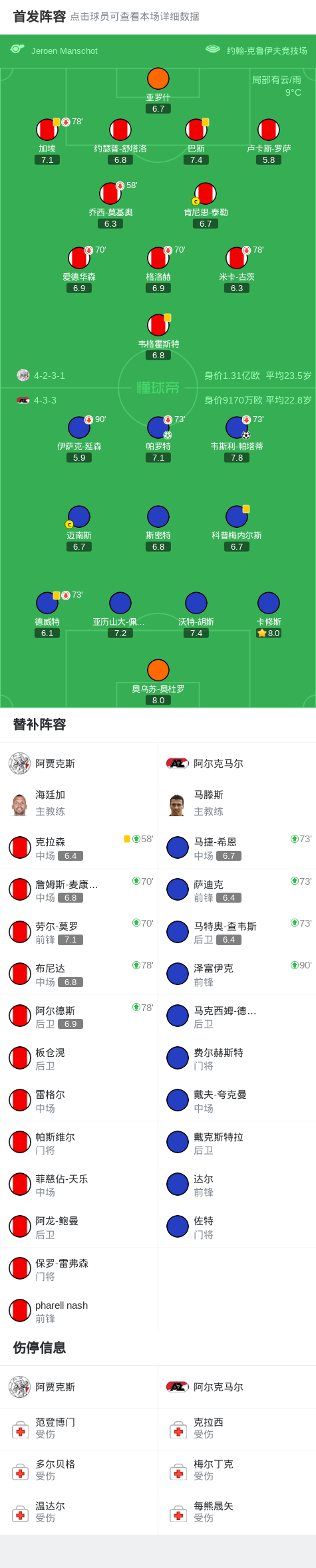 本场比赛,阿尔克马尔在控球率、射门次数等关键数据上均占据优势。球队通过高效的反击与精准的定位球战术,成功限制了阿贾克斯的进攻。而阿贾克斯尽管占据主场之利,但进攻端缺乏创造力,最终未能改写比分。