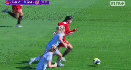 第34分钟,周欣怡持球突破到弧顶处,随后起脚远射。然而,皮球并未如她所愿钻入球门,而是偏出了球门范围。尽管如此,周欣怡的这次射门依然展现出了她出色的个人能力和进攻欲望。