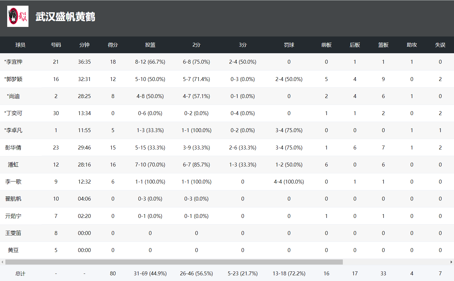 本场比赛中,武汉女篮全队四人得分上双。李宜桦出战37分钟,12投8中(三分4中2),贡献18分1篮板1助攻;郭梦颖出战33分钟,10投5中(三分3中0,罚球4中2),拿下12分9篮板;彭华倩出战30分钟,15投5中(三分6中2,罚球4中3),得到15分7篮板;潘虹出战28分钟,10投7中(三分3中1,罚球2中1),收获16分6篮板。