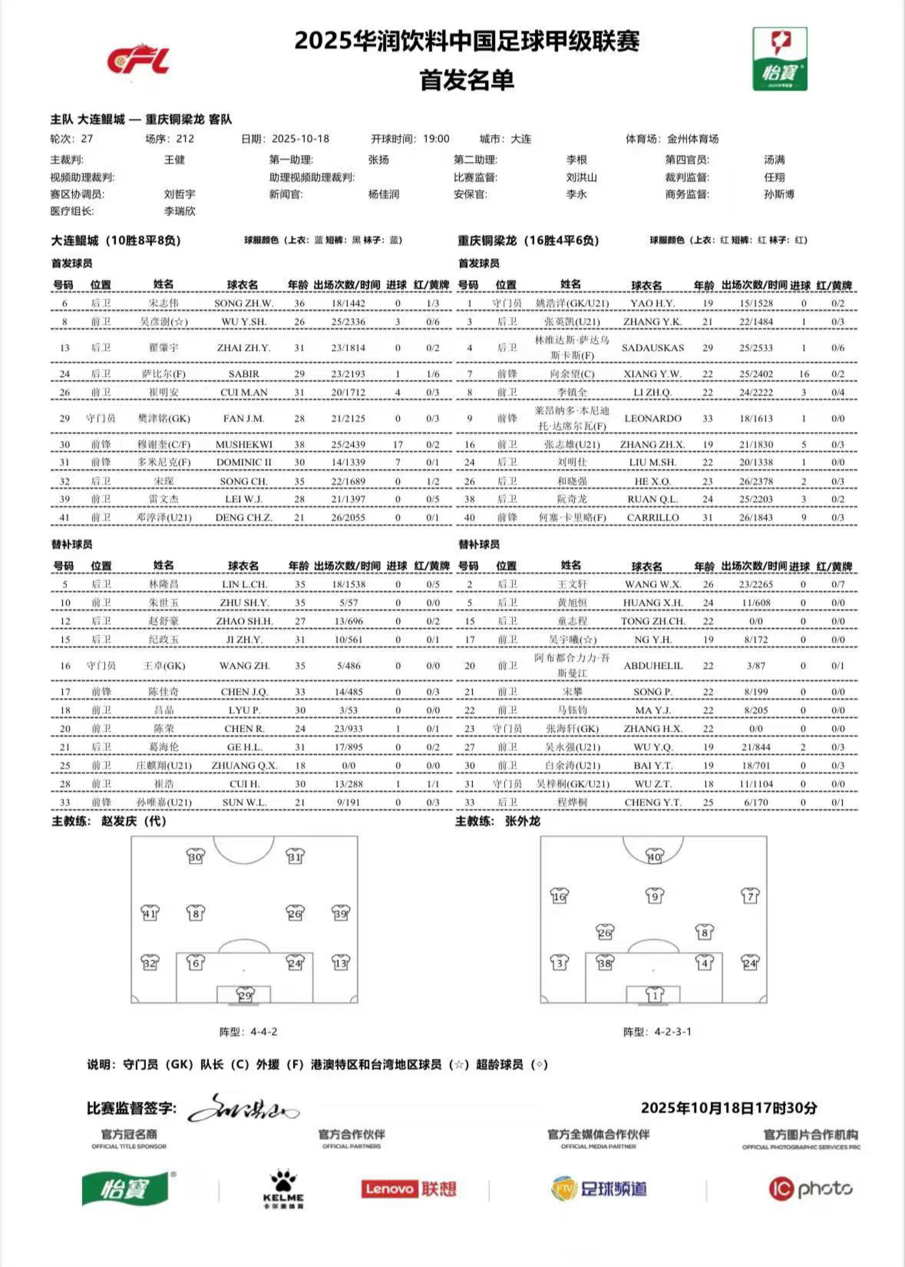 重庆铜梁龙方面,首发阵容同样星光熠熠:门将1号姚浩洋将镇守球门,后防线上,3号张英凯、38号阮奇龙和4号萨达乌斯卡斯将携手筑起铜墙铁壁。中场方面,24号刘明仕、26号和晓强、8号李镇全和16号张志雄将掌控比赛节奏。而锋线上,7号向余望、9号莱昂纳多-席尔瓦和40号何塞-卡里略的组合,无疑将给大连鲲城的后防线带来巨大压力。