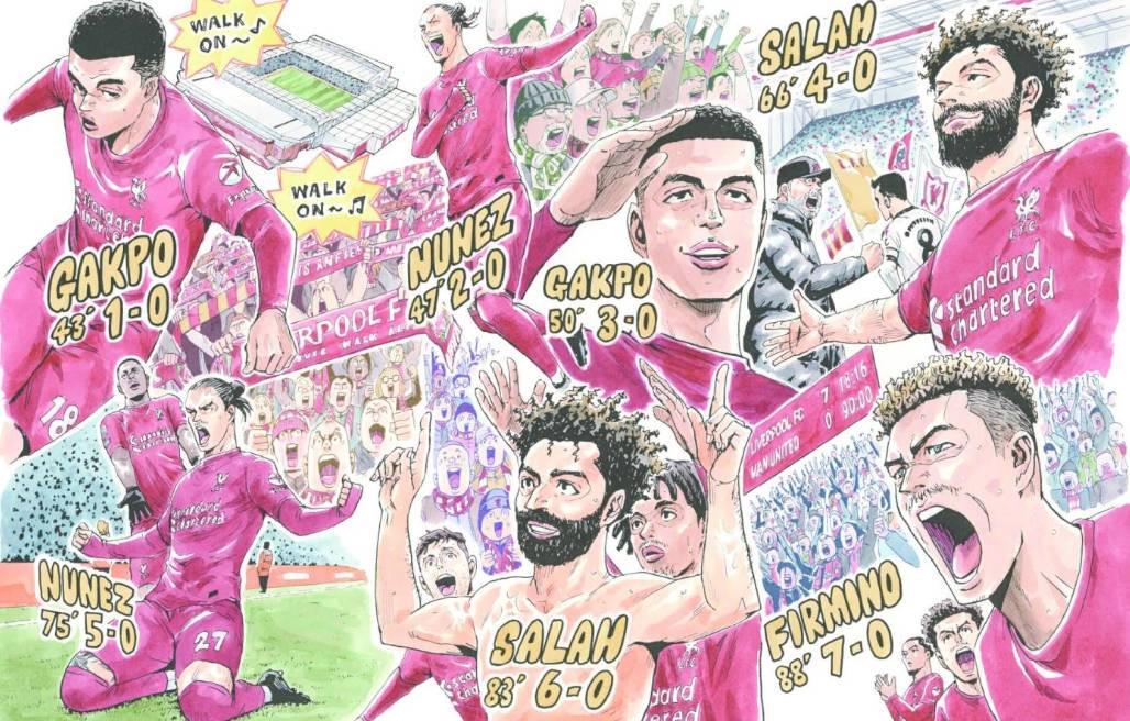 北京时间明日23:30,英超第8轮焦点战即将在安菲尔德球场打响,利物浦将坐镇主场迎战曼联。在这场备受瞩目的双红会前夕,日本知名漫画出版社讲谈社特别发布了一幅纪念漫画,重现了2023年3月利物浦在安菲尔德球场以7-0大胜曼联的经典战役。