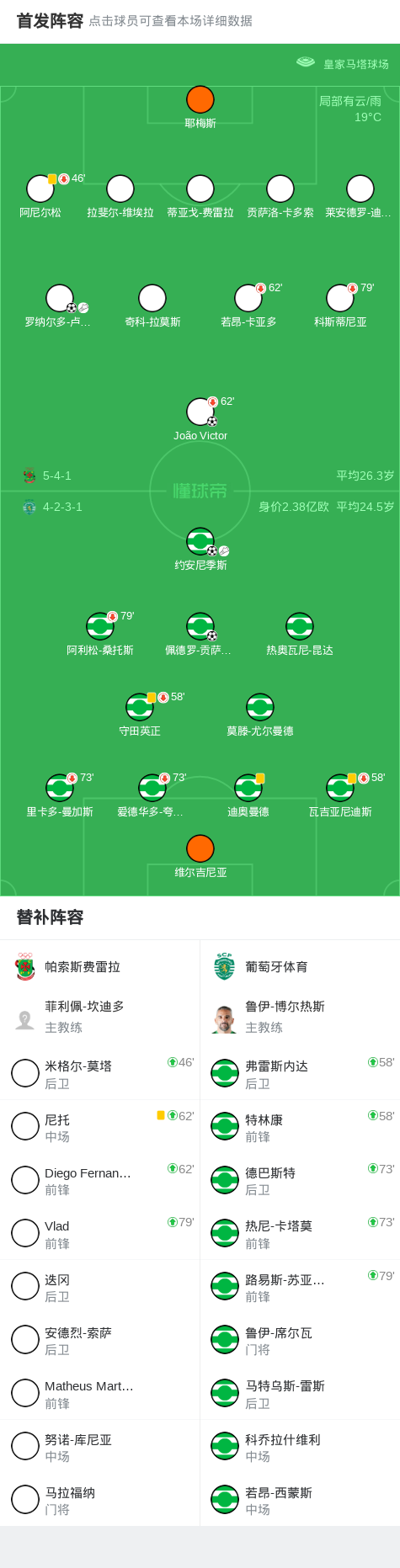 易边再战,双方继续展开激烈争夺。第48分钟,罗纳尔多-卢蒙戈再次展现出色状态,他送出妙传,助攻队友João Victor破门得分,帮助帕索斯费雷拉再度占据优势。然而,葡萄牙体育并未放弃,第60分钟,约安尼季斯挺身而出,他凭借个人能力攻入关键进球,将比分定格为2比2。