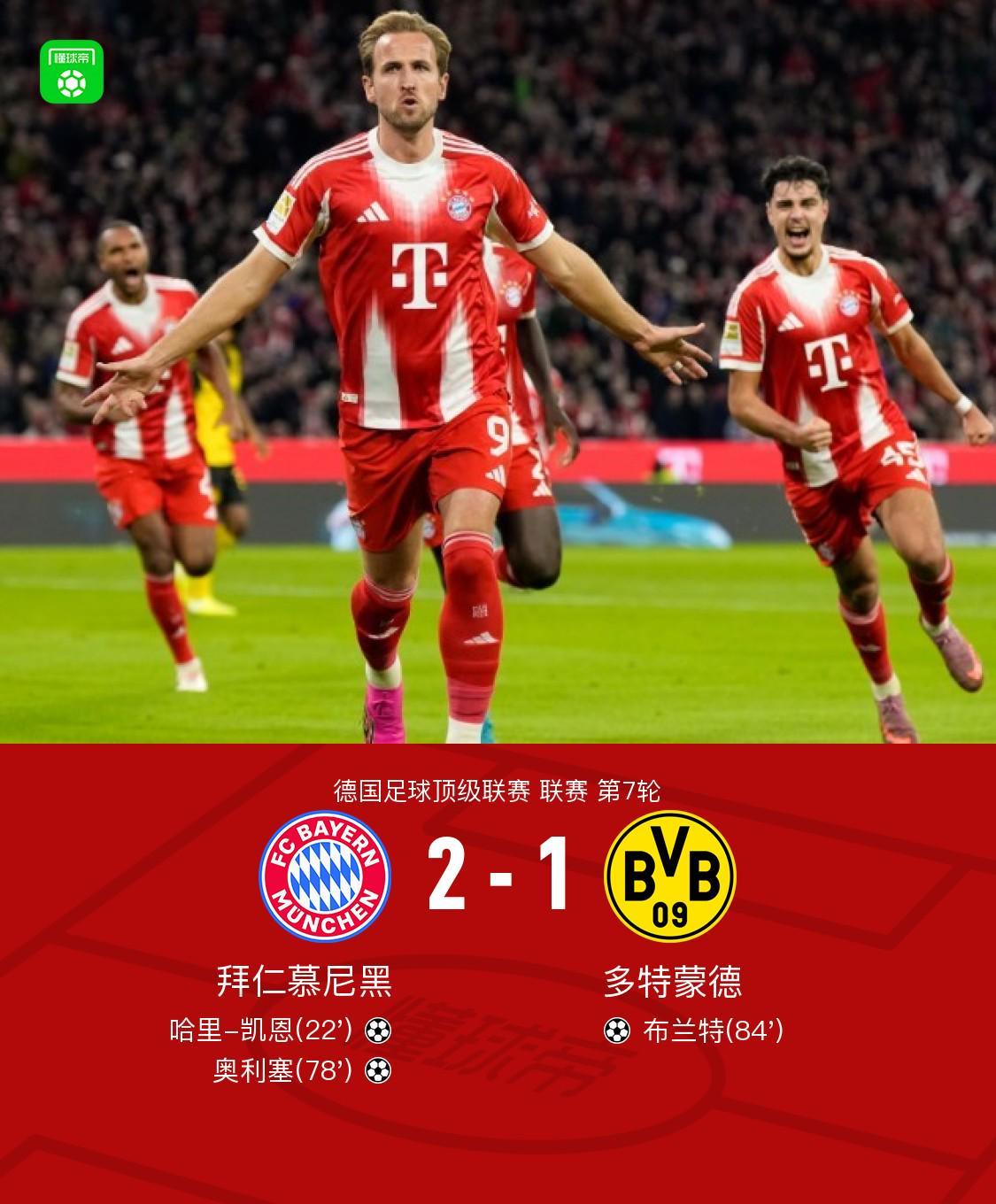 北京时间10月19日,德国足球甲级联赛第7轮迎来一场焦点对决,拜仁慕尼黑坐镇安联球场迎战老对手多特蒙德。上半场第22分钟,基米希开出角球,凯恩力压防守球员头槌破门,帮助拜仁取得领先;奥利塞低射打在门框上弹出。下半场第78分钟,小贝林厄姆解围失误,奥利塞抓住机会铲射破门扩大比分;第84分钟,布兰特门前抢点射门为多特蒙德扳回一城。最终,拜仁慕尼黑以2-1的比分战胜多特蒙德。