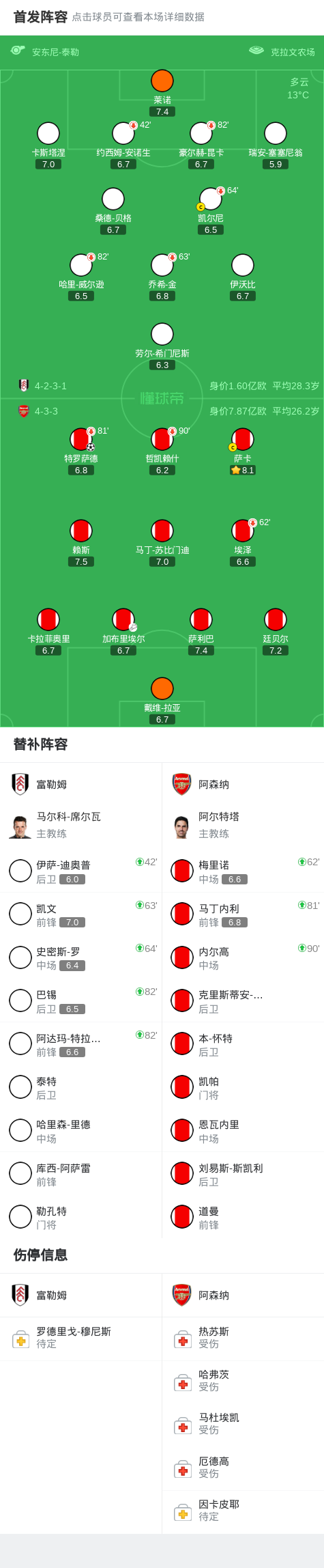 双方首发阵容方面,阿森纳排出4-3-3阵型,萨卡、特罗萨德、热苏斯组成三叉戟。富勒姆则以4-2-3-1应战,希门尼斯领衔锋线。比赛第42分钟安诺生伤退成为主队意外损失。