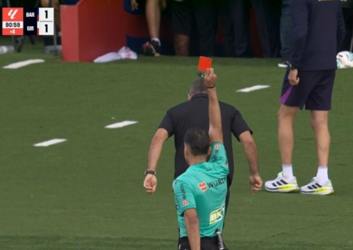 易边再战,巴萨持续向对手施压。第51分钟,费尔明的射门击中立柱弹出,错失反超良机。第70分钟,拉什福德在禁区内被放倒,但主裁判未予判罚,引发巴萨球员不满。比赛进入补时阶段,场上风云突变——第91分钟,弗里克因激烈抗议裁判判罚被直接出示红牌罚下,成为本场比赛的重大转折点。