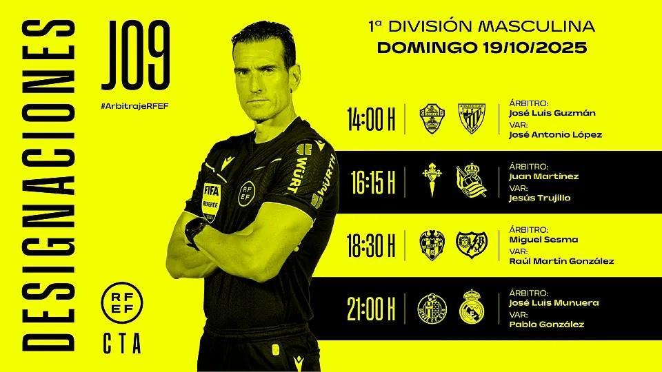 西班牙足协官方近日正式公布了周日西甲联赛多场焦点战的裁判团队安排,其中最受关注的赫塔费与皇家马德里的对决,将由国际级裁判何塞-穆努埃拉担任主裁判,VAR视频助理裁判则由巴勃罗-冈萨雷斯担任。